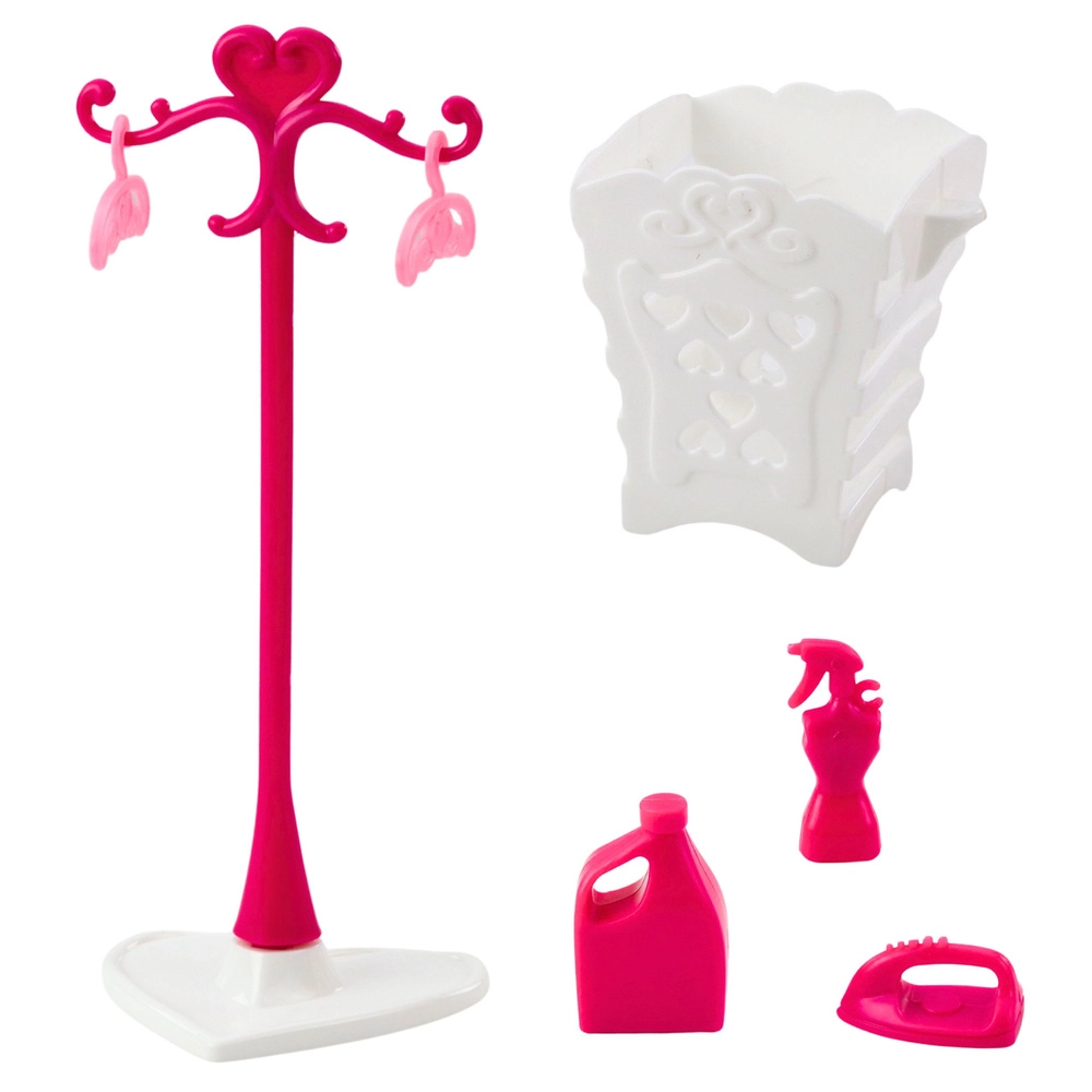 W zestawie znajdują się suszarka, kosz na pranie, żelazko, spryskiwacz, buteleczka „proszku” oraz stojący wieszak z wieszakami, aby idealnie zorganizować strefę zabawy.