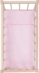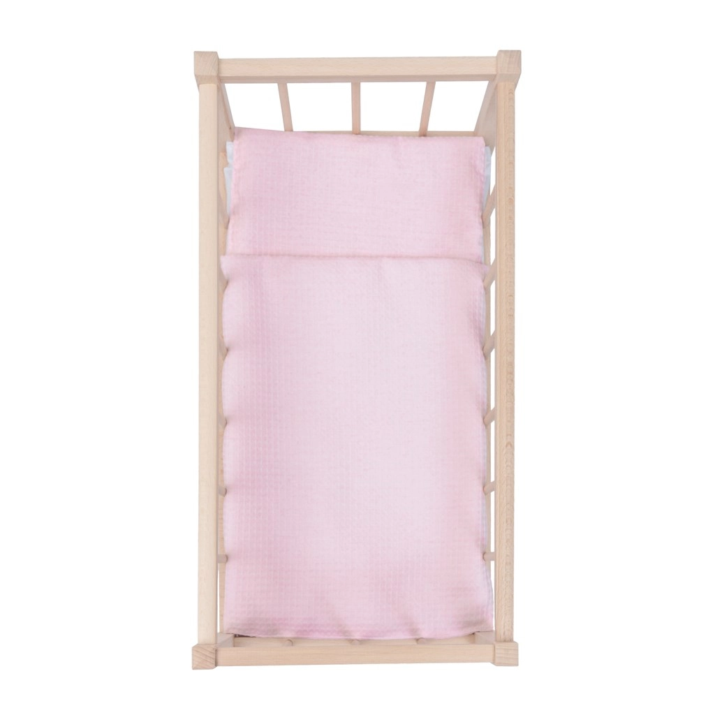 Ta drewniana kołyska dla lalek łączy naturalny wygląd, bezpieczeństwo i radość z zabawy. Gładko szlifowane drewno bez ostrych krawędzi jest łagodne dla dziecięcych rąk, a solidna konstrukcja zapewnia długą trwałość podczas codziennej zabawy. W zestawie znajduje się mięciutki materac oraz dwustronny komplet pościeli w delikatnych różowych tonach, które pasują do każdego dziecięcego pokoju.