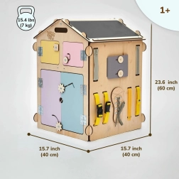 Pastelowy domek aktywności BusyKids to przemyślana pomoc Montessori dla maluchów i przedszkolaków. Dzieci bawią się w nim, chowają, a jednocześnie naturalnie trenują koordynację ręka–oko, koncentrację i cierpliwość. Dach skrywa tablicę do rysowania i puzzle do wkładania, a ściany zachęcają suwakami, rzepem, lampką dotykową, budzikiem, elementami motorycznymi, przyciskami, oknami i drzwiami. Otwieranie, zamykanie oraz wkładanie i wyjmowanie zabawek do środka i na zewnątrz dzieci po prostu uwielbiają.