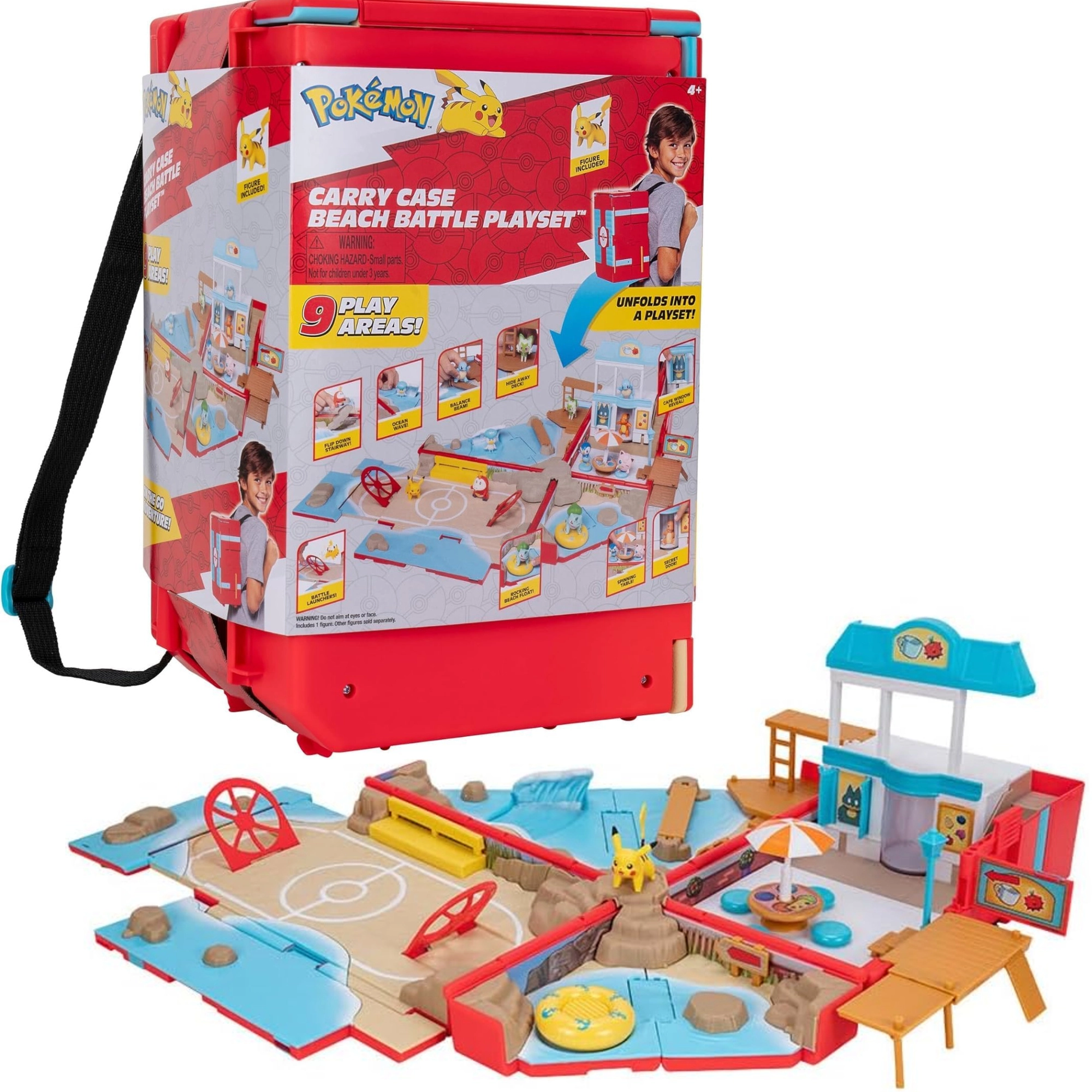 Przenośny zestaw do zabawy Pokémon Beach Battle od Jazwares w mgnieniu oka zmienia się z kompaktowego plecaka w szczegółową scenę plażową z promenadą, molo i basenem. Zawiera figurkę PIKACHU (ok. 5 cm), elementy interaktywne i łatwo się przenosi na wycieczki i do znajomych. Idealny do kreatywnej zabawy dla fanów świata POKÉMON.