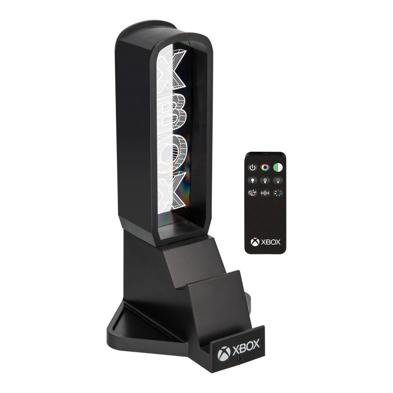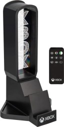 Stylowy stojak do gier dla XBOX o wysokości 30 cm oferuje podświetlenie LED z kilkoma trybami, praktyczny uchwyt na słuchawki i telefon oraz 2× porty USB‑C do ładowania akcesoriów. Wygodne sterowanie zapewnia pilot zdalnego sterowania, a zasilanie odbywa się przez dołączony kabel USB.
