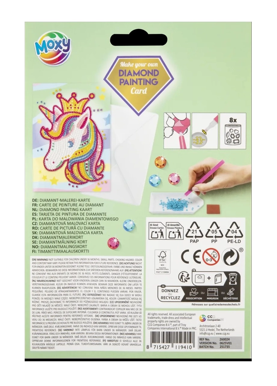 - Różne rodzaje diamentów/kamyczków, szablon/obrazek, długopis aplikacyjny, klejący kwadracik, tacka, koperta prezentowa