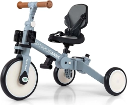 Łatwo przełączysz się między 5 trybami: trójkołowiec z pedałami używanymi jako podnóżki i z drążkiem prowadzącym, trójkołowy jeździk, trójkołowiec z pedałami na przednim kole, jeździk z drążkiem prowadzącym oraz klasyczny jeździk. Kompaktowa, składana konstrukcja sprawdzi się w podróży i w małych mieszkaniach, a pedały można schować do uchwytu na kolumnie kierownicy lub użyć jako podnóżków pod ramą.