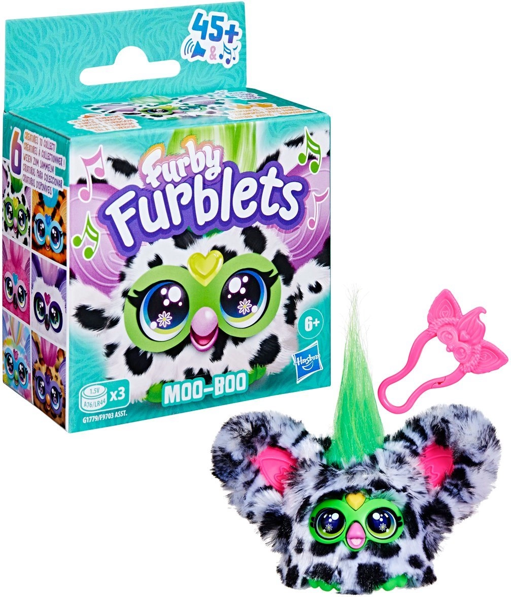 Uroczy towarzysz Hasbro Furby Furblet Moo-Boo przynosi mnóstwo zabawy w podróży i w domu. Oferuje ponad 45 reakcji dźwiękowych, mówi językiem Furbish, odtwarza wesołą muzykę i potrafi harmonizować z innymi Furbletami oraz dużym FURBY. Dzięki odpinanemu klipsowi łatwo przypniesz go do plecaka lub torby. Baterie LR44 w zestawie.