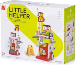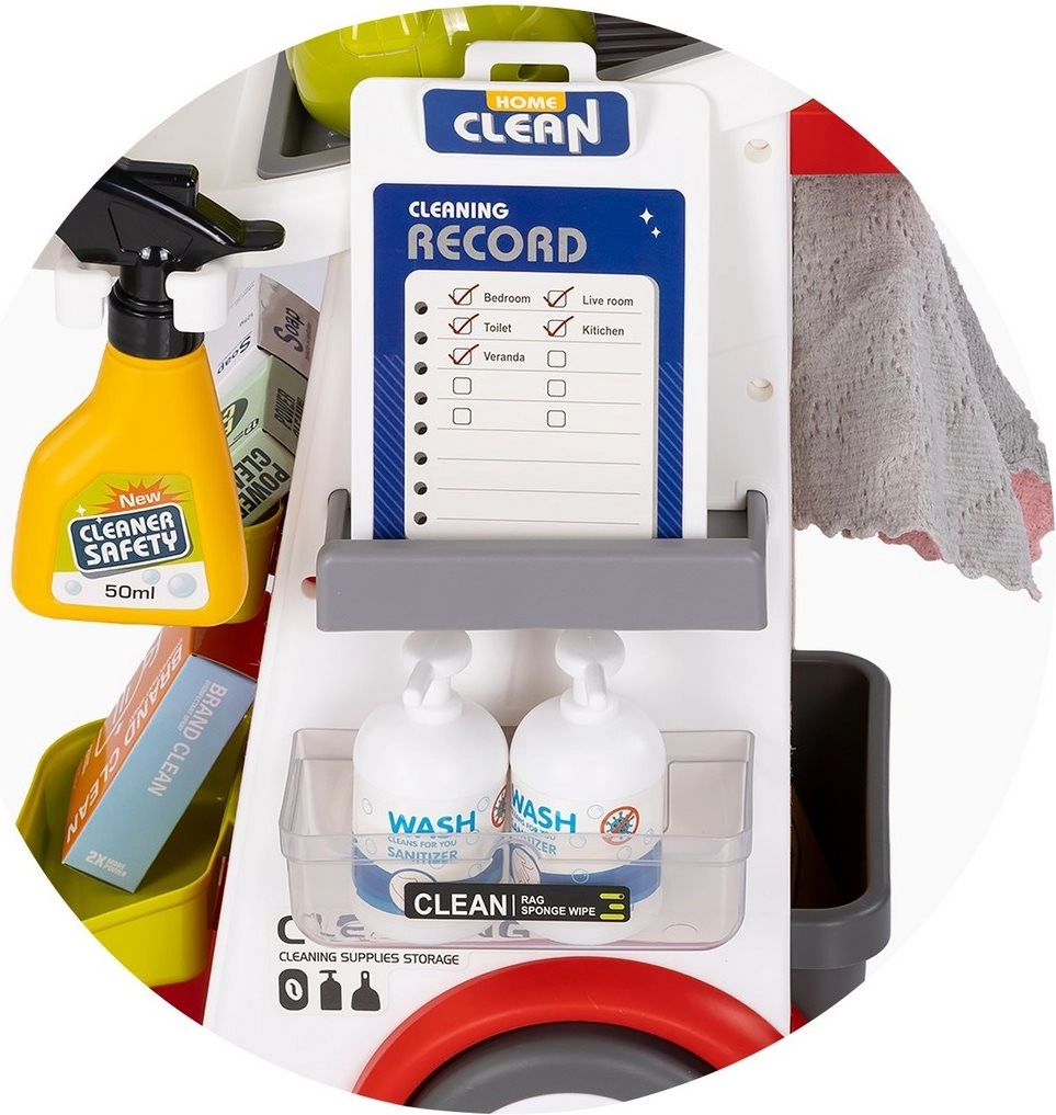 Praktyczny wózek z haczykami i półkami mieści mop, szczotkę, zmiotkę, szufelkę oraz spryskiwacz. Dzieci łatwo uczą się organizacji i sprzątania po zabawie.