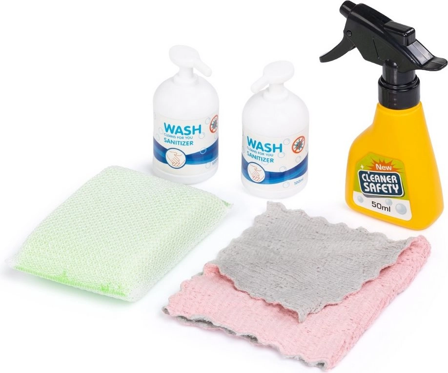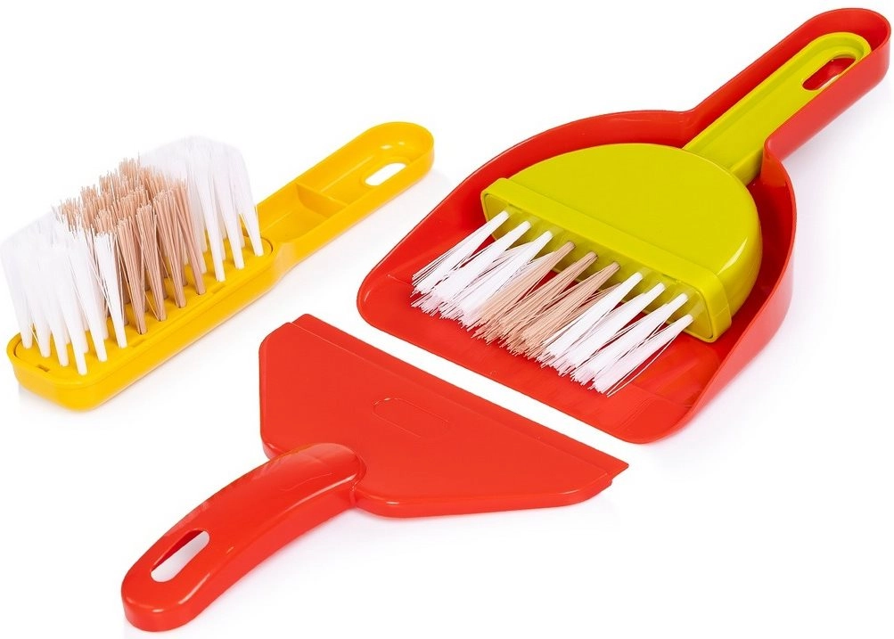 W skład zestawu wchodzi szeroki pakiet dodatków: odkurzacz, mop, szczotka, zmiotka i szufelka, butelka ze spryskiwaczem, gąbka i ściereczki, a także znak ostrzegawczy i kosz (w zależności od wersji). Wszystko dopasowane do dziecięcych rąk dla bezpiecznego chwytu i łatwego odkładania na wózek. Wysokiej jakości materiały gwarantują długą żywotność nawet przy częstym użytkowaniu.