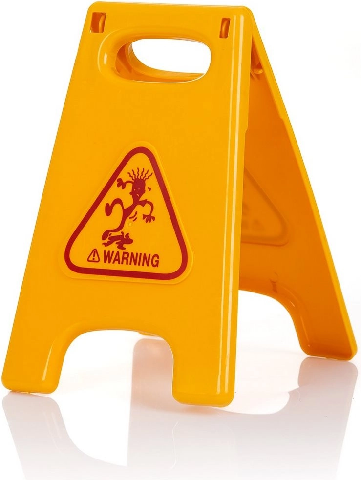 Tabliczka ostrzegawcza i akcesoria do „czystego domu” uczą dzieci troskliwości i bezpiecznych zachowań podczas domowych czynności.