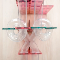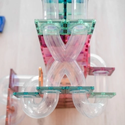 Mocne magnesy neodymowe i przezroczyste pastelowe elementy umożliwiają tworzenie wysokich wież, tuneli i lejków, przez które kulki płynnie przejeżdżają.