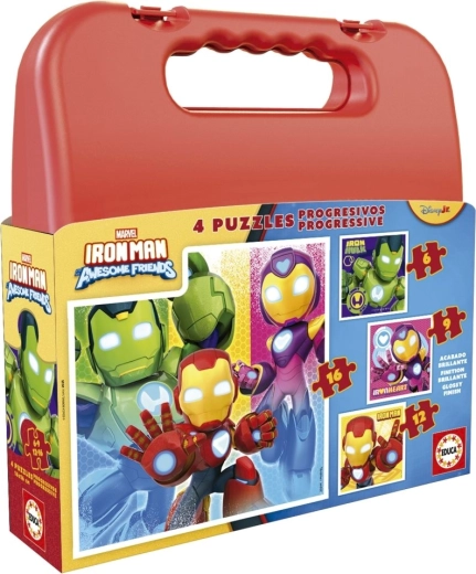Zabawny zestaw czterech progresywnych puzzli z motywem IRON MAN ucieszy małych fanów superbohaterów. Każde puzzle ma inną liczbę elementów (6, 9, 12 i 16), dzięki czemu dzieci mogą stopniowo zwiększać poziom trudności i rozwijać logiczne myślenie, cierpliwość oraz motorykę małą. Praktyczna plastikowa walizeczka ułatwia przenoszenie i przechowywanie.