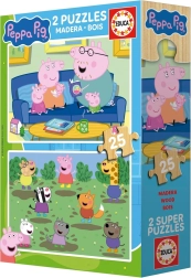 Ten zestaw drewnianych puzzli przedstawia ulubione postacie z animowanego serialu Świnka PEPPA. Dzięki solidnemu wykonaniu, naturalnym materiałom i wyrazistym kolorom puzzle świetnie sprawdzą się do codziennej zabawy i pierwszych prób układania. Każde opakowanie zawiera dwa obrazki z taką samą liczbą elementów i identycznym rozmiarem.