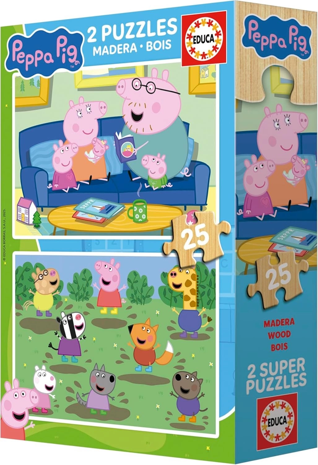 Odkryj wysokiej jakości drewniane puzzle z motywem Świnki PEPPA w dwóch obrazkach po 25 elementów. Puzzle wykonane są z trwałego naturalnego drewna, mają duże elementy ułatwiające manipulację i intensywne kolory, które natychmiast przyciągają uwagę dzieci. Idealne pierwsze puzzle dla małych rączek i świetny wybór do rozwoju motoryki małej oraz koncentracji.