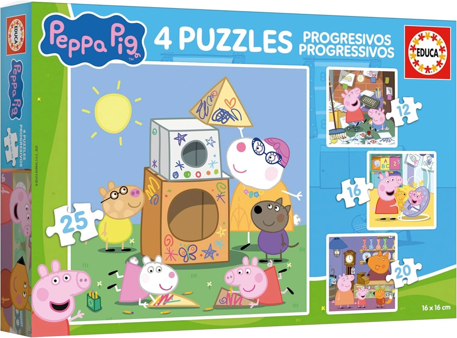 Odkryj zabawny zestaw czterech progresywnych puzzli z motywem ŚWINKA PEPPA marki Educa. Każde puzzle ma inną liczbę elementów (12, 16, 20 i 25), dzięki czemu doskonale nadaje się do stopniowego rozwijania umiejętności dzieci. Kompaktowy format 16 × 16 cm jest idealny w podróży i do domowej zabawy.