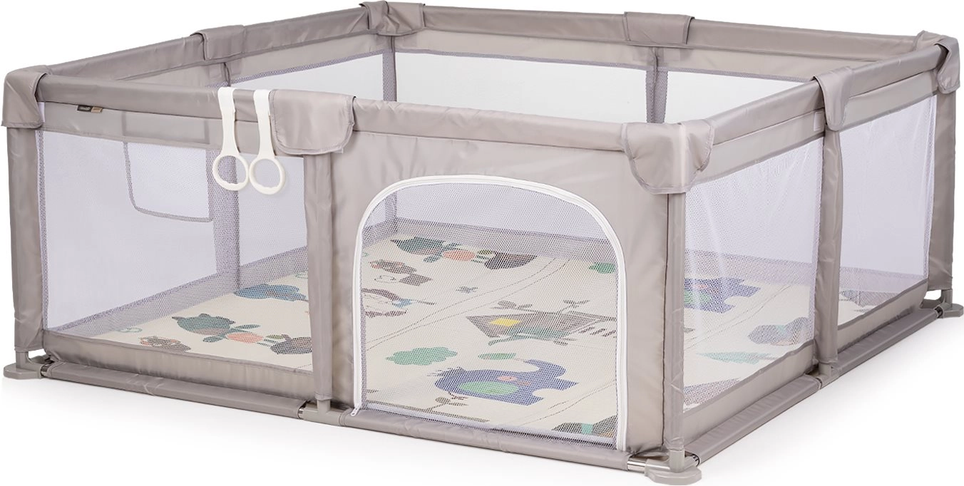 Praktyczny i bezpieczny kojec Sienna oferuje przestronne miejsce do zabawy i odpoczynku. Ma oddychające, siateczkowe ścianki, boczne drzwiczki na zamek dla samodzielnego wejścia, wzmocnioną ramę z miękkim wyściełaniem oraz 2 pierścienie do trzymania do treningu wstawania. Spełnia normę EN 12227:2010.
