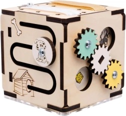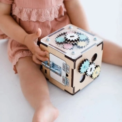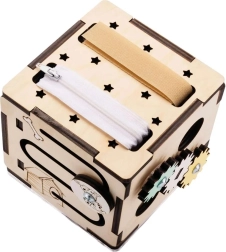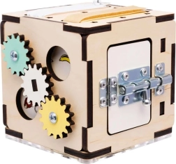 Kompaktowa drewniana interaktywna kostka BUSYKIDS dla dzieci od 1 roku oferuje na sześciu stronach elementy obrotowe, zamki błyskawiczne, klamry i zamki wspierające rozwój motoryki małej, percepcji sensorycznej oraz myślenia logicznego. Jest lekka, bezpieczna i łatwa do przenoszenia – idealna w domu i w podróży.