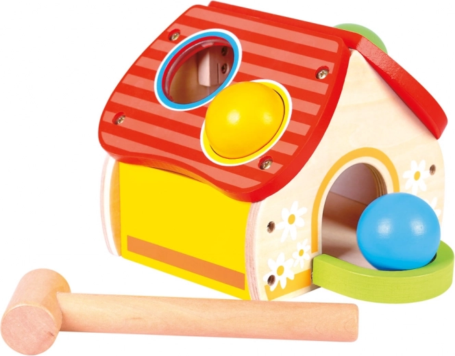 Ta wysokiej jakości drewniana zabawka w formie wesołego domku przyciąga uwagę dzieci wyrazistymi kolorami i prostą zasadą zabawy – piłeczki wkłada się do otworów w dachu i delikatnie wbija młotkiem. Zabawa wspiera rozwój motoryki, cierpliwość oraz precyzję.