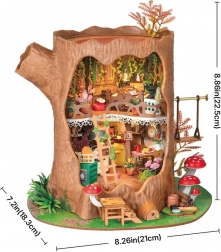 Wejdź do świata fantazji i stwórz własną Leśną chatkę z pnia – dwupiętrowy mini domek z drewnianymi meblami, kuchnią, sypialnią, dekoracjami, grzybowym ogródkiem i zewnętrzną huśtawką. Po włączeniu oświetlenia LED model zamienia się w urzekającą ekspozycję i staje się ozdobą każdej półki.
