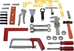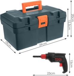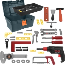 Zawartość zestawu: walizka, młotek, śrubokręt płaski i krzyżowy, ruchoma ręczna piła, klucz oczkowy, klucz nastawny, klucz płaski, klucz nasadowy, suwmiarka, poziomica, kątownik, szpachelka, pilnik, elementy łączące, listwy, śruby i nakrętki. Wiertarka ma obrotowe wiertło bez potrzeby użycia baterii, dzięki czemu zabawa jest płynna i intuicyjna.