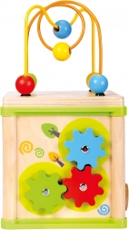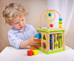 Ta wielofunkcyjna kostka motoryczna łączy pięć ulubionych aktywności: sorter kształtów, przekładnie zębate, kręte prowadnice z przesuwanymi elementami, dopasowywanie zwierzątek do ich pożywienia oraz górny labirynt z koralikami. Każda ścianka kostki została zaprojektowana tak, aby stymulować koordynację ręka–oko, cierpliwość i koncentrację.