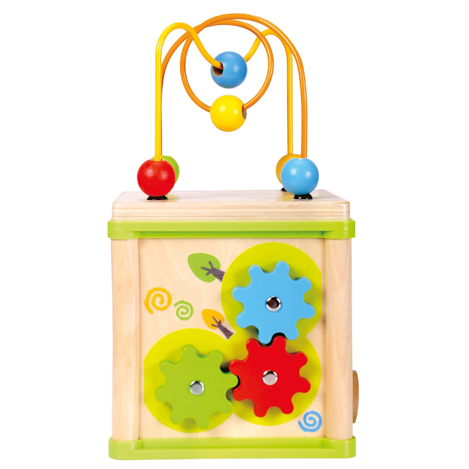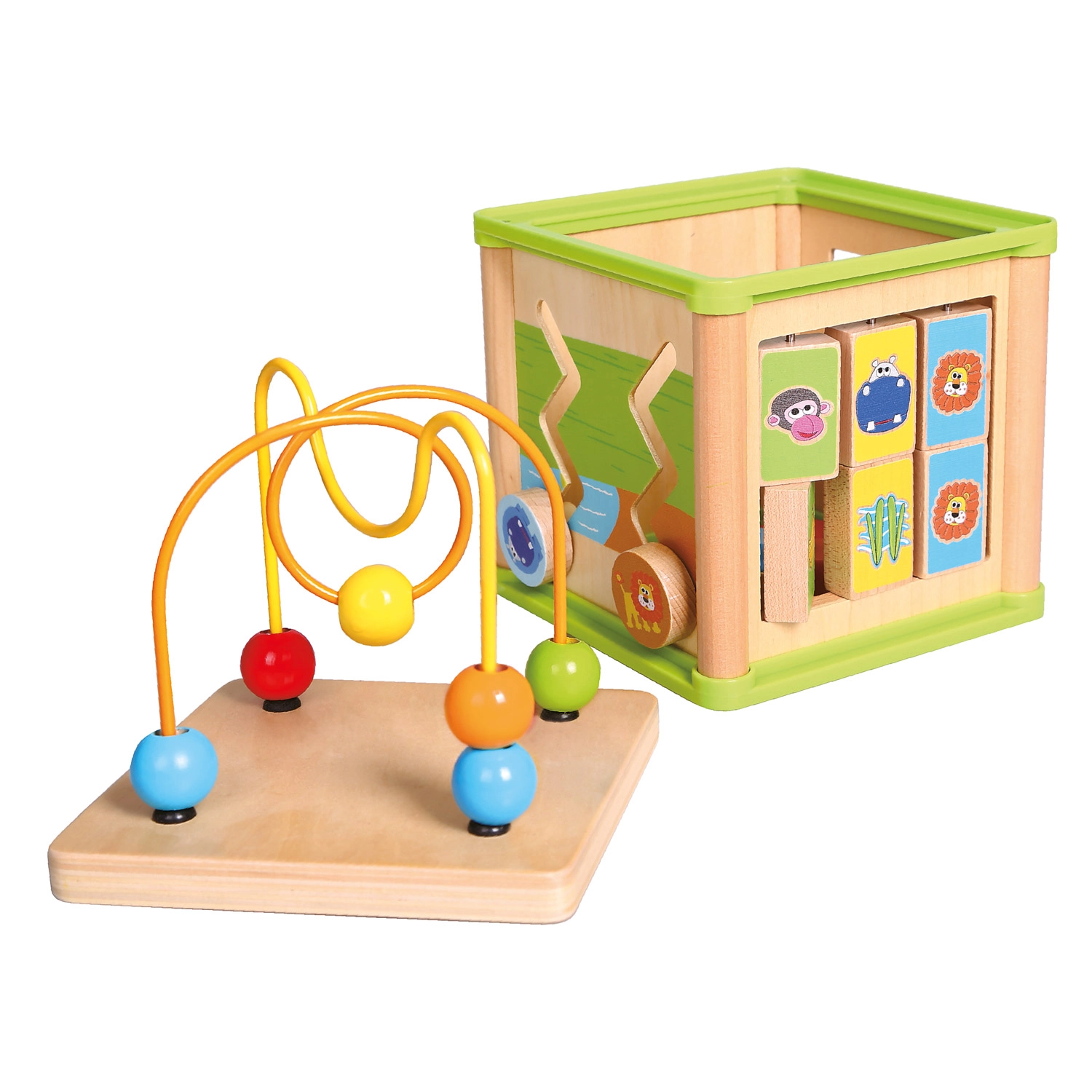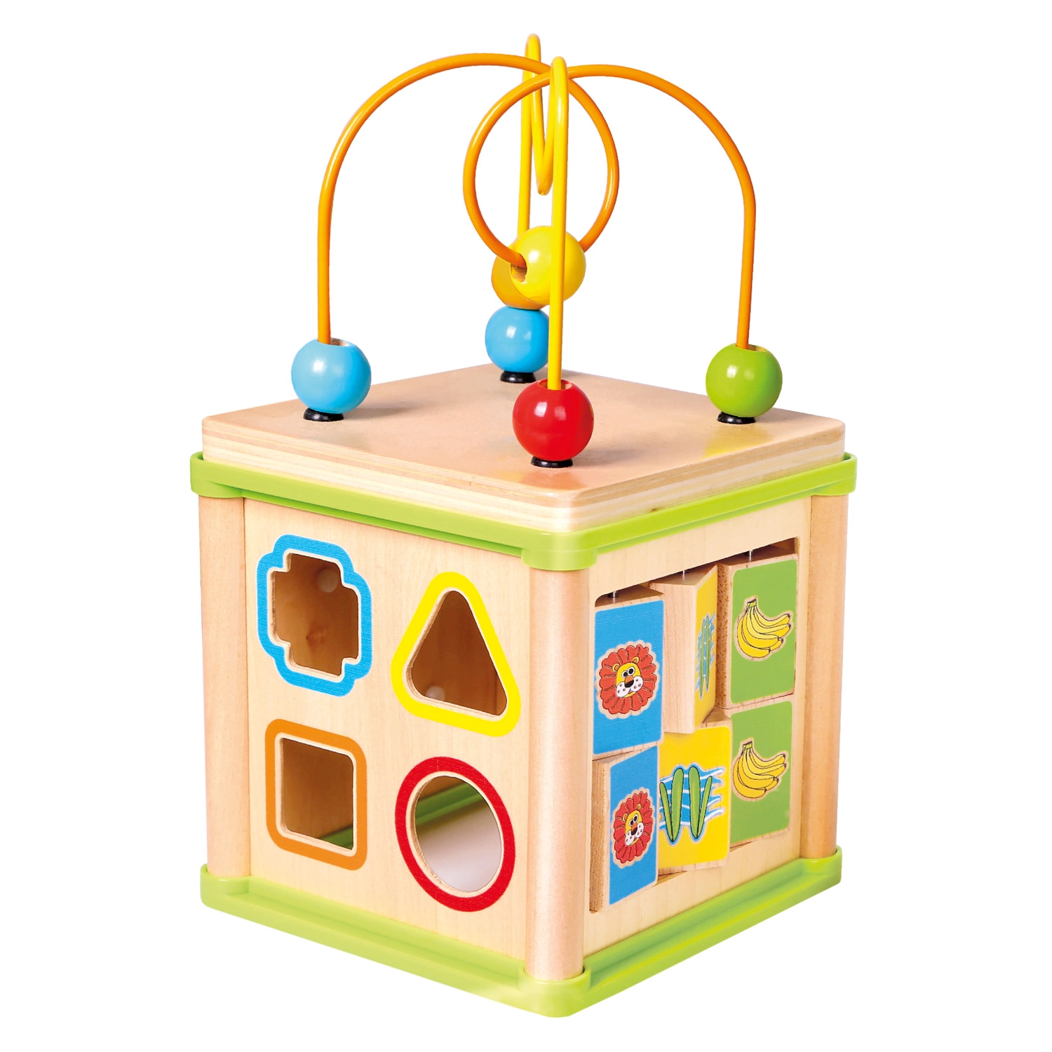 Ta wszechstronna drewniana aktywna kostka łączy pięć atrakcyjnych elementów zabawy w jednym kompaktowym wydaniu. Dzieci mogą dopasowywać zwierzątka do ich pożywienia, prowadzić koraliki po krętych torach, poznawać działanie zębatych kółek lub trenować sorter kształtów. Górną część tworzy labirynt z koralikami, który wspiera koordynację oko–ręka i koncentrację.