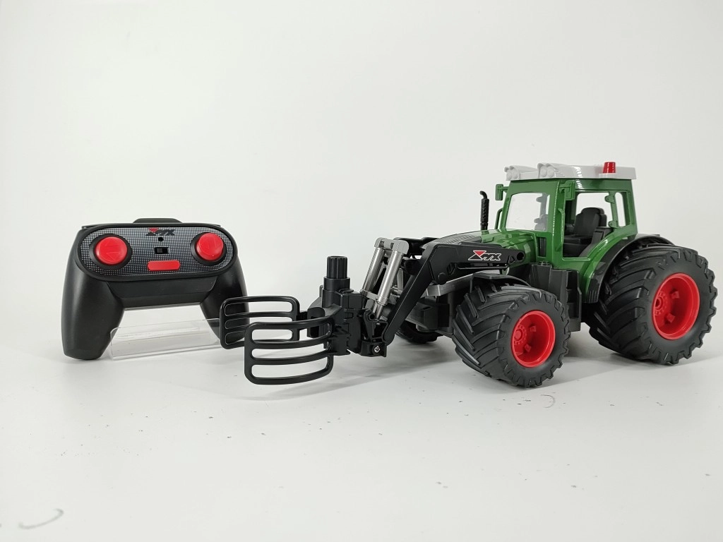 Przednie ramię załadowcze z chwytakiem umożliwia łatwe chwytanie i przenoszenie bel, dzięki czemu dzieci mogą naśladować prawdziwe prace rolnicze. Sterowanie odbywa się za pomocą ergonomicznego kontrolera 2.4 GHz z sześcioma kanałami dla płynnej jazdy i skręcania, o zasięgu do 30 metrów. Ładowany akumulator Li-ion 3,7 V ładuje się przez USB, co jest wygodne i ekonomiczne.