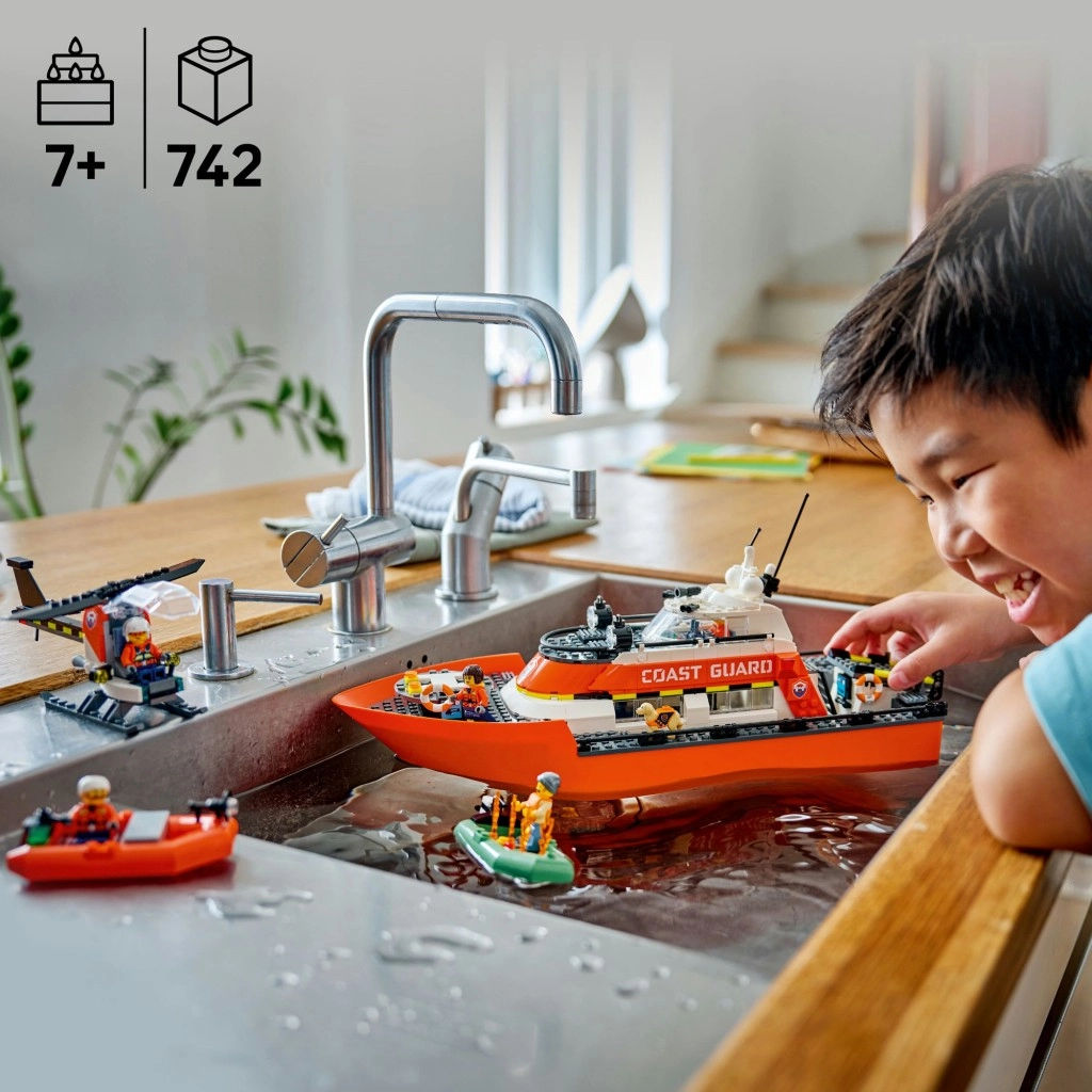 Ten szczegółowo dopracowany zestaw zapewnia dzieciom od 7 lat autentyczne wrażenia z misji ratunkowych. Duża łódź ratunkowa z pomarańczowym kadłubem i białą nadbudówką ma trzy zdejmowane sekcje dla łatwego dostępu do mostka, kajut i kuchni. Na rufie znajdziesz lądowisko do lądowania helikoptera oraz rampę do wodowania pontonu z silnikiem. Cały główny statek jest zaprojektowany tak, aby pływał na wodzie, co zwiększa realizm zabawy w wannie i basenie.