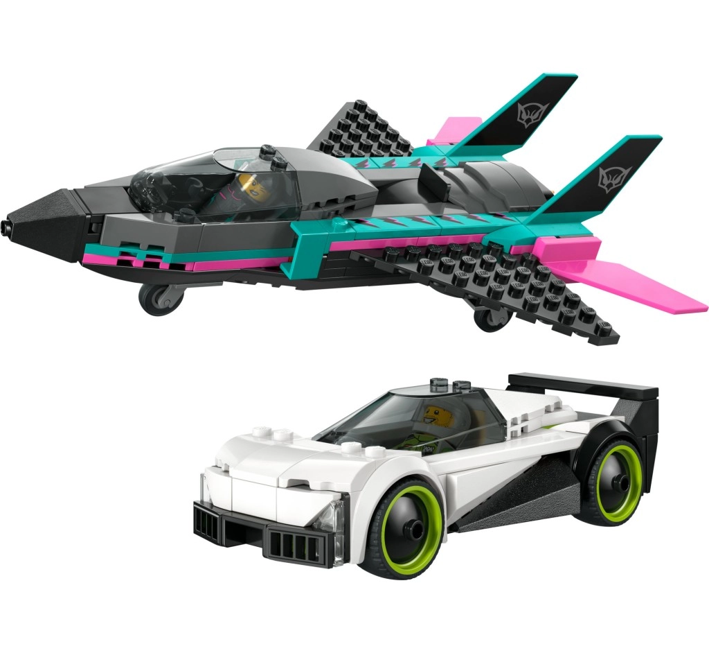 Ten dynamiczny zestaw łączy szybkość i kreatywność: elegancki biały samochód wyścigowy z neonowozielonymi felgami oraz aerodynamiczny odrzutowiec w czarno-turkusowo-różowej kolorystyce. Otwierane kokpity ułatwiają umieszczanie minifigurek i przygotowują scenę do emocjonujących wyścigów i podniebnych pokazów.