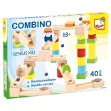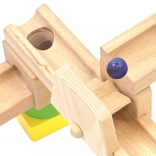 Zestaw zawiera 40 elementów, z czego 34 tworzą tor, a 6 to szklane kulki. Elementy z litego drewna w naturalnych i żywych kolorach dodają grze wizualnego uroku i umożliwiają dzieciom ćwiczenie koncentracji oraz zręczności.