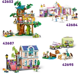 W zestawie są minifigurki Liann, Aliya i instruktorka Cindy, konie Coco i Thunder, a także dwie koty i mały pies. Nie brakuje dodatków, takich jak taczka na siano, pojemniki na karmę, przeszkody, trofea i tablica z lekcjami, które wspierają otwartą, kreatywną zabawę.
