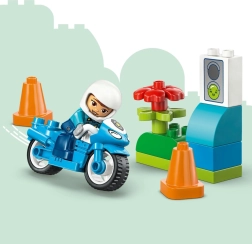 Odkryj zabawny i edukacyjny zestaw LEGO DUPLO dla najmłodszych: niebieski policyjny motocykl z policjantką, pachołkami drogowymi i prostym dodatkiem do zabawy na drodze. Duże klocki są bezpieczne i łatwe do chwytania, wspierają motorykę małą, kreatywność oraz naukę przepisów ruchu drogowego poprzez zabawę.