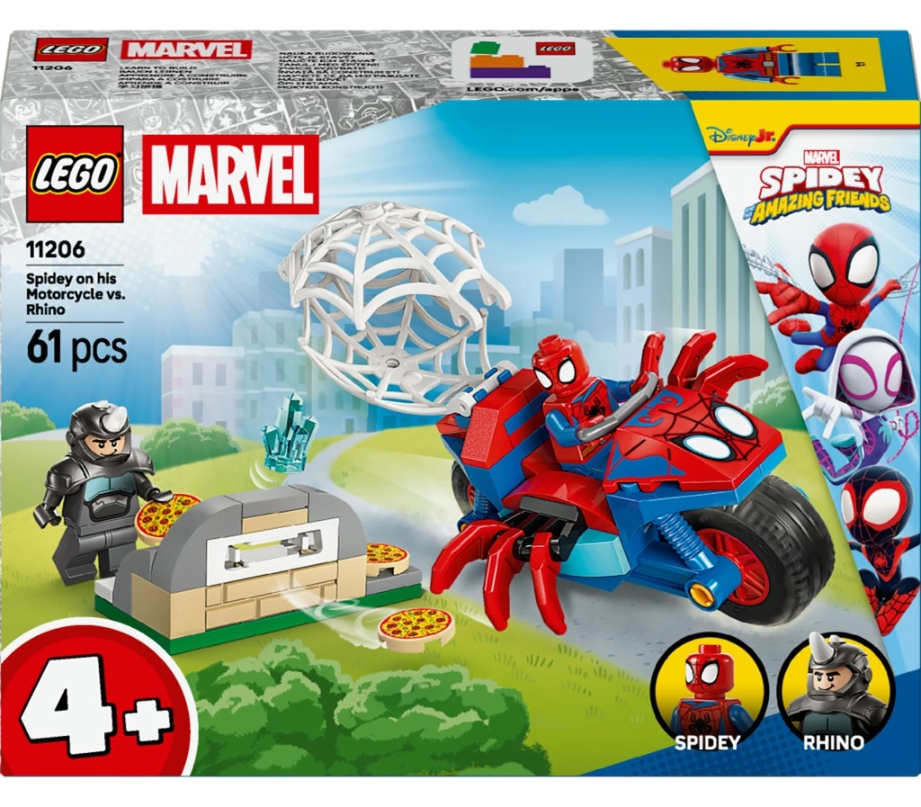 Wejdź do pełnego akcji świata superbohaterów z zestawem LEGO dla dzieci od 4 lat, w którym SPIDEY na pajęczym motocyklu staje do walki ze złoczyńcą RHINO. Czeka na ciebie proste budowanie z 61 elementów, dwie minifigurki, świetny motocykl z pajęczyną oraz zabawny piec do pizzy do tworzenia pomysłowych historii. Idealny prezent dla małych fanów MARVELA i serialu „Spidey i super-kumple”.