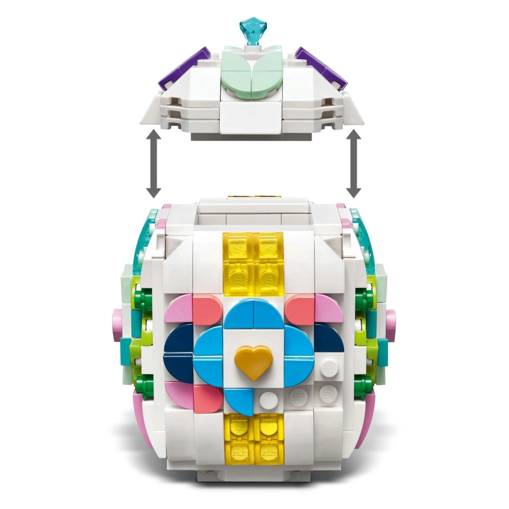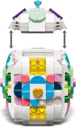 To eleganckie białe jajko z klocków LEGO ma wysokość około 10 cm i szerokość 7,9 cm – idealny rozmiar na półkę, stół lub wielkanocną aranżację. Dzięki bogatemu zestawowi pastelowych i transparentnych elementów (serduszka, listki, „diamenty”) łatwo stworzysz oryginalny wzór i w każdej chwili go zmienisz.