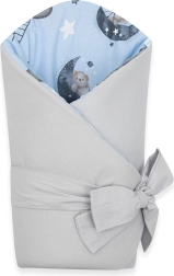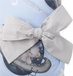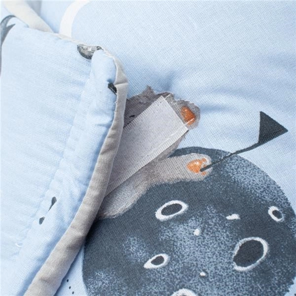 Design z uroczym misiem w kosmosie ucieszy dziecięce oczy i ociepli wygląd każdego wózka oraz łóżeczka. Zapięcie na rzep umożliwia szybkie i łatwe otulenie, a wstążka wiązana w kokardę pomaga niezawodnie ustabilizować rożek.