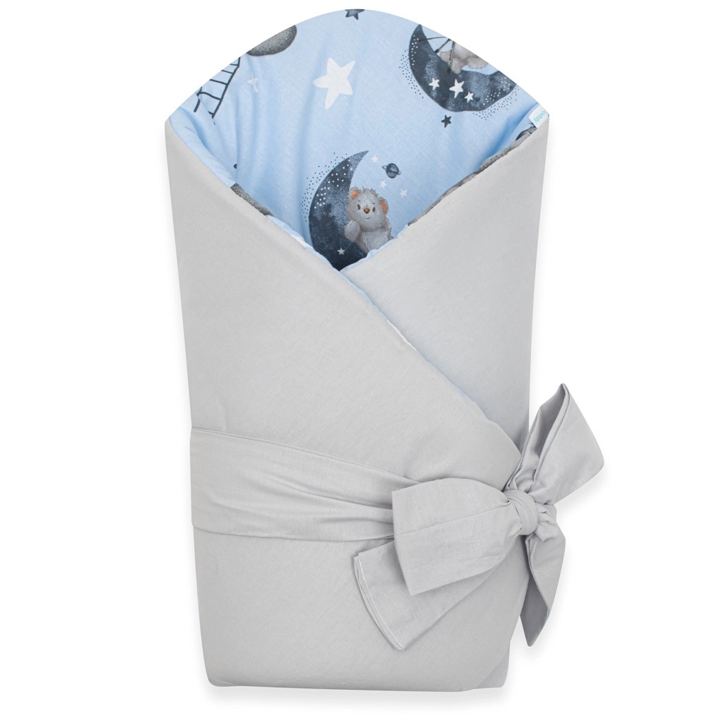 Miękki i ciepły dwustronny rożek dla niemowląt z motywem Teddy Bear in Space marki New Baby. Dzięki grubemu wypełnieniu 3 cm idealny także na chłodniejsze dni, jest stabilny, a jednocześnie przyjemny w dotyku. Praktyczne zapięcie na rzep uzupełnia wstążka do zawiązania kokardy dla pewnego i wygodnego otulenia. Materiały są antyalergiczne i bezpieczne, z certyfikatem OEKO-TEX STANDARD 100.