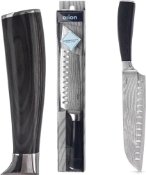 Precyzyjny kuchenny nóż santoku o całkowitej długości 31 cm i ostrzu 18 cm z 67‑warstwowej damasceńskiej stali dla wyjątkowej ostrości i trwałości. Ergonomiczna rękojeść z drewna pakka świetnie leży w dłoni, a szlify grantonowe na klindze minimalizują przywieranie produktów. Idealny do krojenia, siekania i plastryzowania owoców, warzyw i mięsa w kuchni domowej i profesjonalnej.
