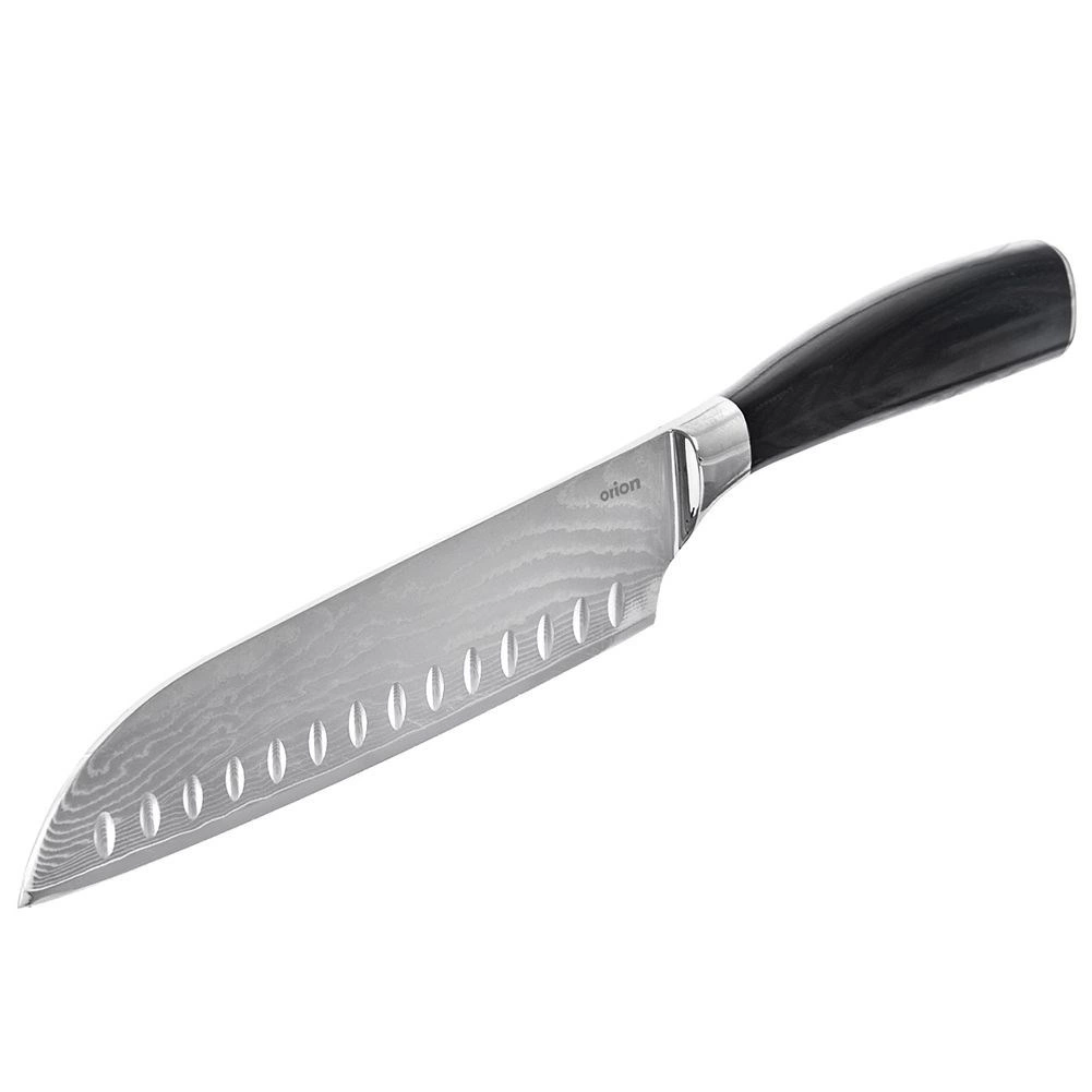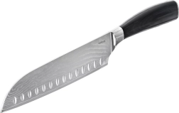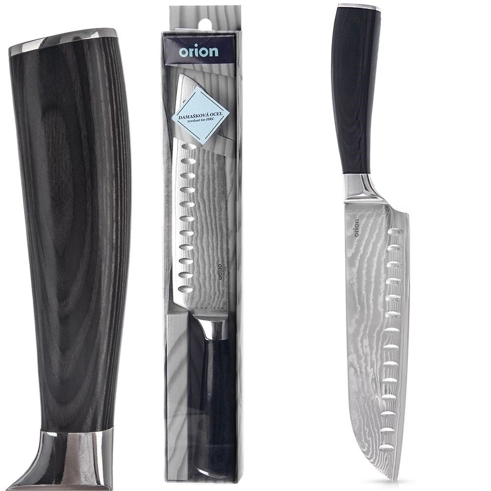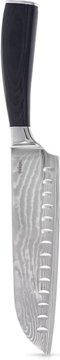 Nóż santoku łączy japońską inspirację z europejskimi standardami wykonania. 67‑warstwowa damasceńska stal zapewnia wyjątkową twardość, trwałość i długotrwałą ostrość, a płaski profil klingi ułatwia precyzyjne cięcia i szybką obróbkę składników. Dzięki wgłębieniom grantonowym plastry nie przywierają do klingi, a krojenie jest płynne.