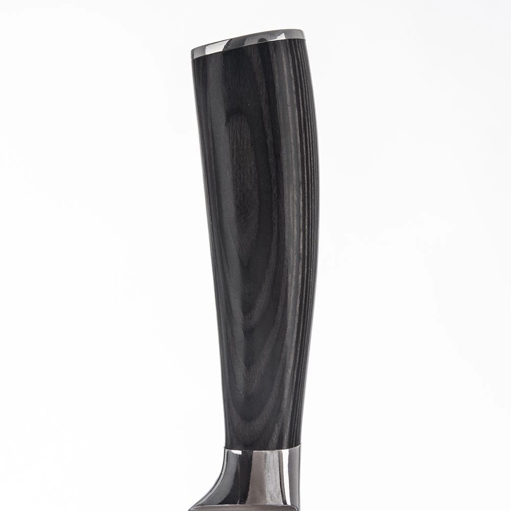 Rękojeść z drewna pakka jest odporna na wilgoć, ciepło i chemikalia, a jej ergonomiczne wyprofilowanie zapewnia bezpieczny chwyt i maksymalną kontrolę. Nóż to uniwersalny wybór do codziennej pracy – od delikatnego plastryzowania po siekanie ziół czy porcjowanie.