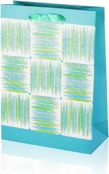Ta torebka prezentowa A5 łączy praktyczne wymiary z atrakcyjnym designem. Błyszcząca powierzchnia, dekoracyjny panel w paski oraz wstążkowe uchwyty nadają Twojemu prezentowi premium wygląd. Torebka ma składane boki i solidne dno dla stabilności podczas wkładania przedmiotów.