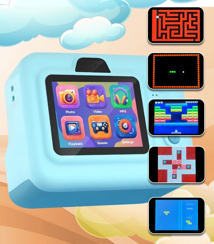 Aparat łączy fotografowanie, wideo 1080P oraz mini gry (łamigłówki, wąż, pinball, sokoban) dla zabawy i rozwoju kreatywności. Jasny ekran 2,4" i intuicyjna obsługa ułatwiają dzieciom przeglądanie oraz pracę ze zdjęciami i filmami. Obsługa kart pamięci microSD do 32 GB zapewnia dużo miejsca na wspomnienia.