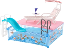 Przezroczysty basen z nadrukiem można napełnić wodą. Zjeżdżalnia i drabinka pozwalają lalkom bezpiecznie „wskoczyć” do wody i cieszyć się letnim orzeźwieniem.