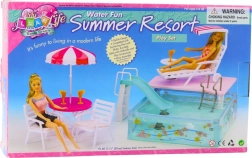 Letni resort dla lalek oferuje wszystko, czego potrzeba do wakacyjnej zabawy: stylowy basen z możliwością napełnienia wodą, funkcjonalną zjeżdżalnię i drabinkę, wygodny kącik z leżakiem oraz zestaw ogrodowy ze stołem, krzesłami i parasolem. Dzięki kolorowemu wzornictwu i starannie zaprojektowanym detalom dzieci łatwo stworzą własne scenki – od relaksu nad wodą po letnie przyjęcia.