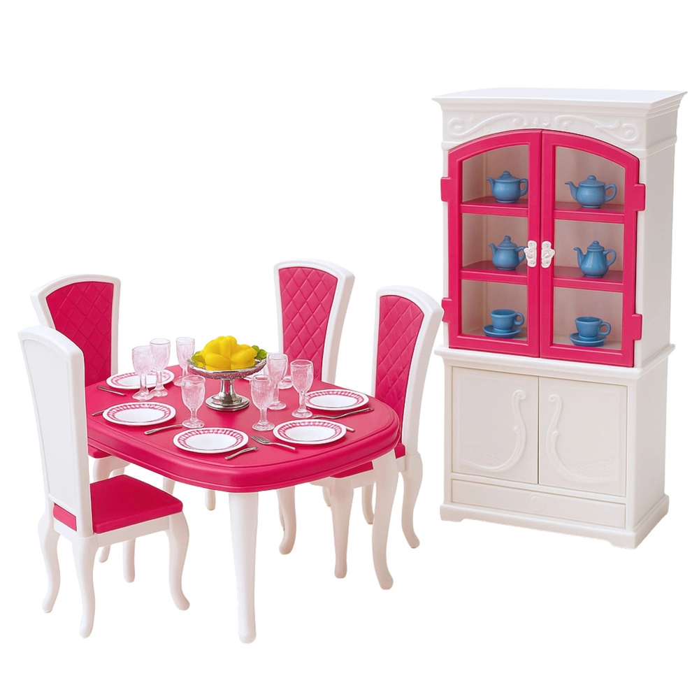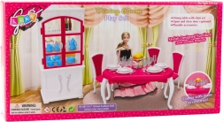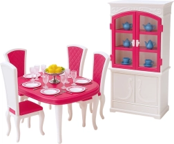 Elegancki zestaw mebli i akcesoriów dla lalek ok. 29 cm zamieni każdy domek w realistyczną jadalnię. Zawiera stół, krzesła, kredens z otwieranymi drzwiczkami oraz bogatą zastawę stołową. Trwałe wykonanie z plastiku, różowo‑białe kolory i klasyczny styl wspierają kreatywną zabawę, rozwój umiejętności społecznych i scenek odgrywania ról. Spełnia normy CE i EN71.