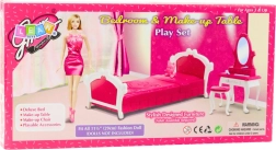 Stylowy zestaw mebli do sypialni dla lalek typu fashion o wysokości ok. 29 cm. Zawiera łóżko, toaletkę z lustrem oraz stołek. Trwałe wykonanie z plastiku, różowo-biała kolorystyka i bezpieczne zaokrąglone kształty wspierają kreatywną zabawę oraz rozwój motoryki małej.