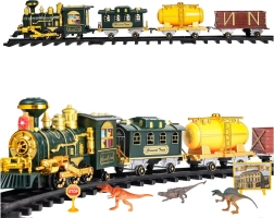 - lokomotywa, wagon pasażerski, cysterna, wagon towarowy, proste tory, zakrzywione tory, pilot RC 27 MHz, figurki dinozaurów, znaki drogowe, naklejki, drzewka