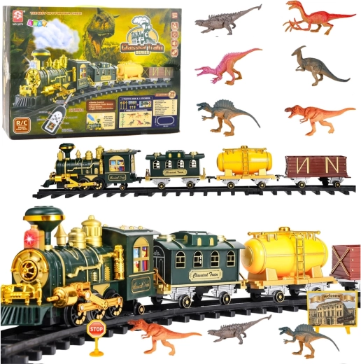 Odkryj atrakcyjną kolejkę, która łączy urok parowych lokomotyw z przygodą prehistorycznego świata. Po dolaniu wody lokomotywa wytwarza realistyczny dym, nie brakuje efektów świetlnych i dźwięków prawdziwego pociągu. Dzięki pilotowi RC 27 MHz łatwo sterujesz kierunkiem i prędkością. W zestawie bogata sceneria z dinozaurami, drzewami, znakami i tematycznymi dodatkami do kreatywnej zabawy.