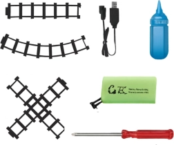- lokomotywa, wagon z węglem, wagon osobowy, wagon towarowy, proste tory, zakręty, skrzyżowanie torów, pilot zdalnego sterowania, buteleczka na wodę, ładowarka USB