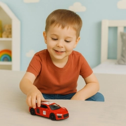 Ten czerwony sportowy pojazd z metalu i wysokiej jakości plastiku zapewnia świetną równowagę rozmiaru i zabawy. Dzięki napędowi pull back wystarczy pociągnąć autko do tyłu i puścić – natychmiast ruszy do przodu. Otwierane drzwi i dopracowane detale nadwozia wspierają kreatywną zabawę i realistyczne scenki.
