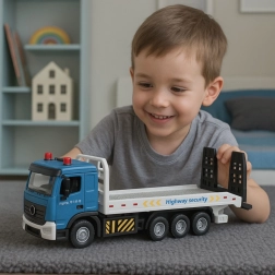 Kluczową funkcją jest uchylna i wysuwana platforma, która umożliwia łatwy wjazd autek. Metalowa kabina podnosi trwałość zabawki, otwierane drzwi zwiększają autentyczność, a światła i dźwięki nadają każdej akcji właściwy efekt. W zestawie znajdują się baterie, więc ciężarówka jest gotowa do jazdy od razu po rozpakowaniu.
