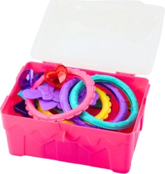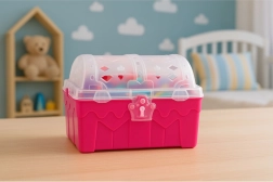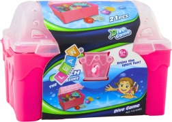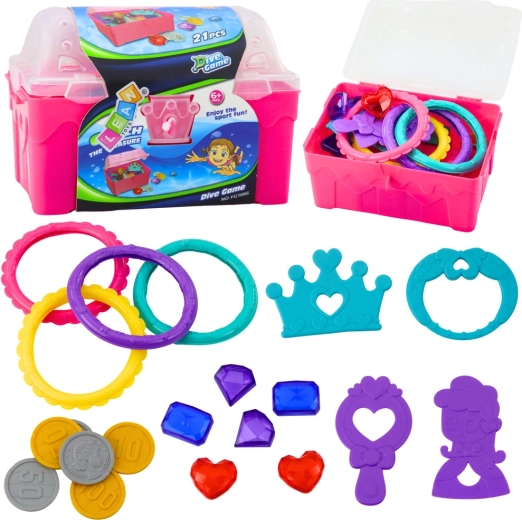 Odkryj magię wodnych przygód z zestawem skarbów do wody. Różowa skrzynia skrywa plastikowe monety, biżuterię, korony i klejnoty, które dzieci mogą chować i wyławiać. Elementy są lekkie, wyraźnie kolorowe i łatwe do chwytania w wodzie.