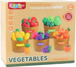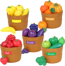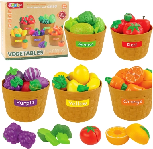 Kolorowy edukacyjny zestaw z 34 elementami uczy dzieci sortowania kolorów, kategorii oraz podstawowych umiejętności kuchennych. Realistyczne owoce i warzywa z bezpiecznego plastiku można kroić na rzep, w zestawie znajdują się koszyczki do sortowania, plastikowy nożyk i deseczka. Świetny wybór do rozwoju motoryki małej, koordynacji ręka–oko oraz kreatywnej zabawy w domu i w przedszkolu.