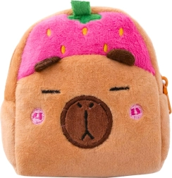 Ten uroczy portfelik/mini etui z mięciutkiego pluszu pomieści monety, banknoty, słuchawki, klucze i inne drobiazgi. Design śpiącej kapibary z różową truskawkową czapeczką i haftowanymi detalami ucieszy dzieci i dorosłych, którzy kochają słodki, mięciutki styl.